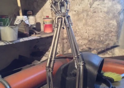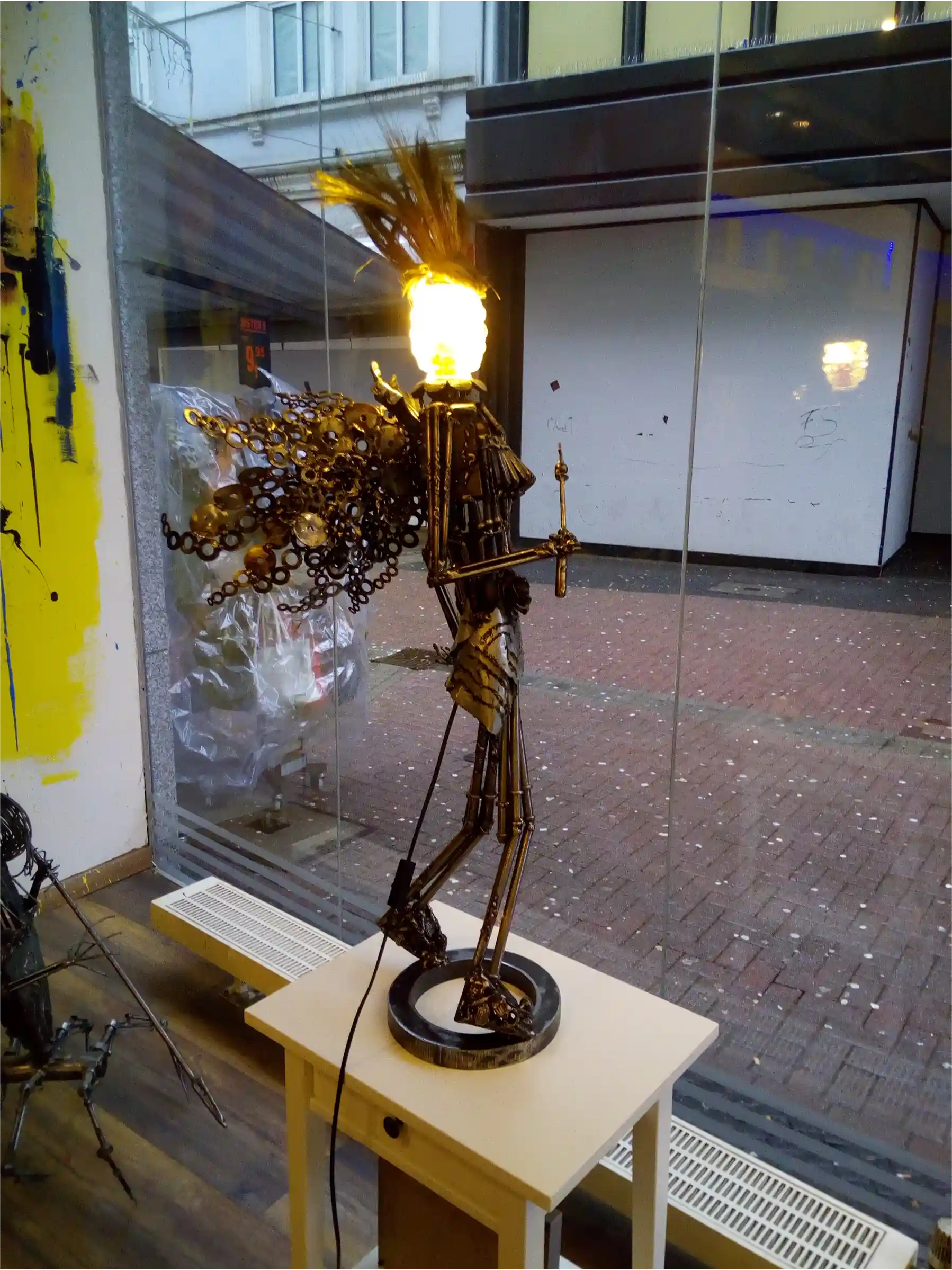 „Die Fee“ ist eine handgefertigte Metalls Skulptur voller Charme und Licht. Sie steht hoch und elegant, mit einer leuchtenden Glühbirne als Kopf und einem Flügel aus Metallunterlegscheiben und Zahnrädern, der wie Magie glänzt. Zart und doch stark – diese Fee vereint Fantasie und Metallkunst auf wahrhaft kreative Weise.